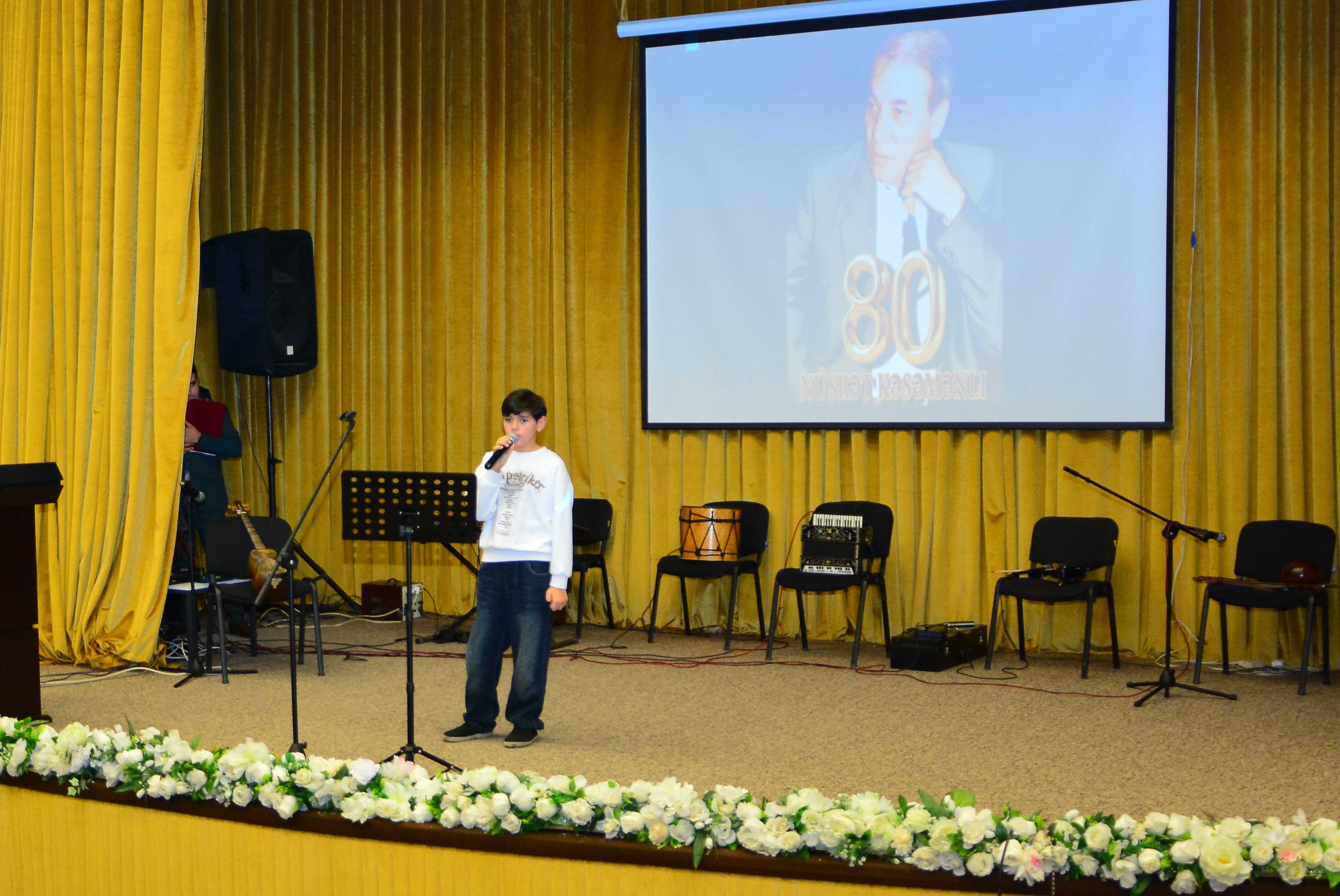 Tədbirin bədii hissəsində Nüsrət Kəsəmənlinin oxucular və dinləyicilər tərəfindən dillər əzbəri olan sevilən şeirləri və sözlərinə bəstələnmiş musiqi əsərləri ifa olunub. Öz növbəsində Nüsrət Kəsəmənlinin oğlu, Bakı Bələdiyyə teatrının aktyoru Rəşad Kəsəmənli "Biri vardı, biri yox", "Mən səni unuda bilmirəm axı", nəvəsi Əli Kəsəmənli "Qar yağır Şəhidlər xiyabanına", ağstafalı mədəniyyət işçisi Oruc Mansırov “Tanış olaq, oxucum, tanış olaq: Bu mənəm”, Bakı Bələdiyyə teatrının aktyorları - İsmayıl Atakişiyev, "Getmək istəyirsən", "Oğru olmaq istəyirəm", Toğrul Rza "Dünən toyun idi", "Əllərin nə yaman soyuqdur gülüm", Ülviyyə Rza "Küsülü qala bilmirəm", "Yox bu sən deyilsən", Günel Həmidova "İsti yağışlar yağır", "Yoxdusa", Zülfiyyə Qurbanova "Əlvida demirəm", "Yandır məktubları", Elməddin Zakiri "Sən demə təzədən sevmək olarmış", "Nə biləydik bu sevginin sonu yox" şeirlərini səsləndiriblər.